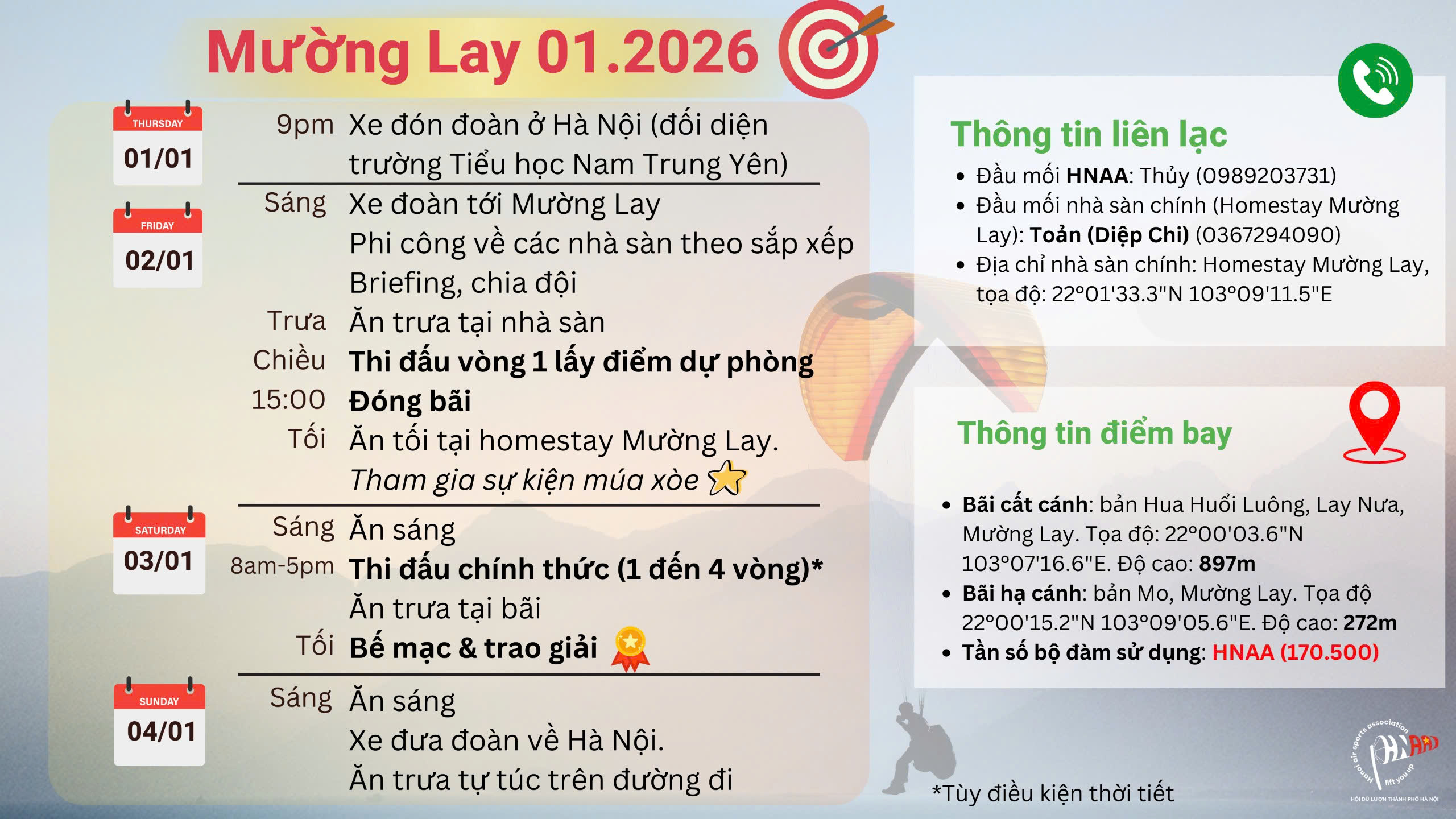 - Với phi công & người nhà đi xe đoàn: 9h tối xuất phát đi Mường Lay từ Lô E5, phố Nguyễn Quốc Trị (Đối diện trường Tiểu học Nam Trung Yên). Phi công có thể gửi xe tại đây